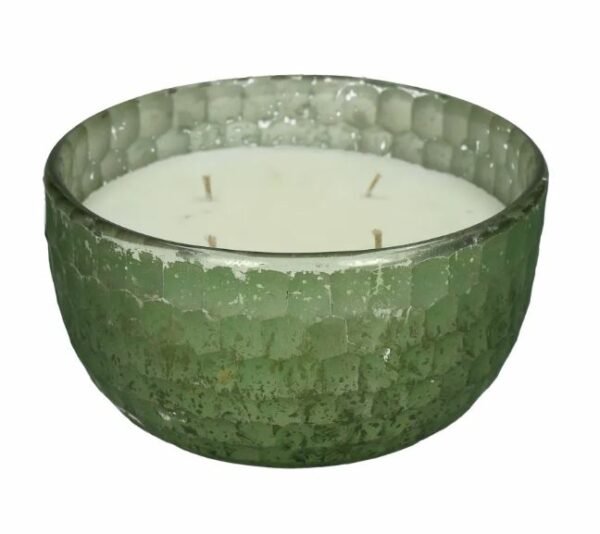 Green metal bowl with candle. Dimensions: Ø18 X H10cm.
