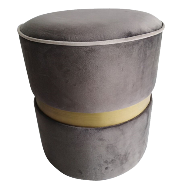 Βελούδινο πουφ σε γκρι χρώμα με μεταλλική χρυσή λεπτομέρεια. Διαστάσεις: Ø40 X H45cm.